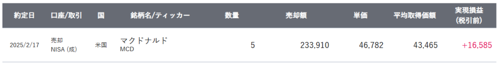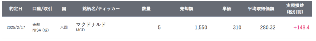 今月はマクドナルドの売却をしました。わずかばかりですが、利益で取引をすることができました。