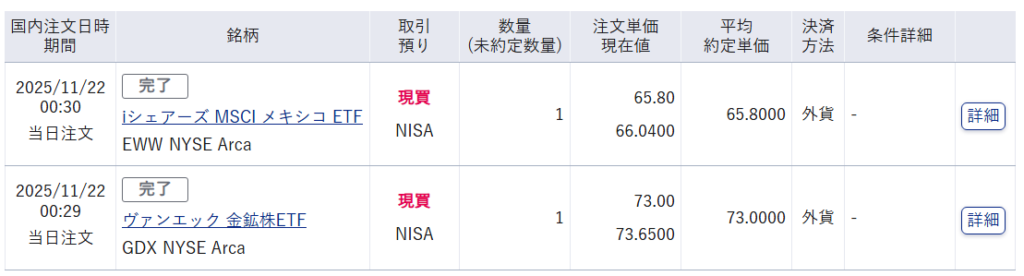 ①iシェアーズ MSCI メキシコ ETF(EWW)・・・こちらの銘柄は、アメリカ株への投資が難しい状況となっており、しばらく買い注文ができておらず、尚且つ今後もまだもう少しアメリカ株への投資が難しそうなので、反対に国際分散投資をしていこうと夫婦で検討しておりましたので、その一環として購入しました。
