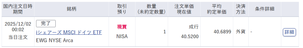 ①iシェアーズ MSCI ドイツETF(EWG)・・・この銘柄は以前より保有しており、今後も買い増しを検討しておりましたが、見ていただいたらわかるとおり成行で買ってしまいました。よほどのタイミングであればまだしも、成行は思わぬ金額で約定することがあるので、できればやめておきましょう。
