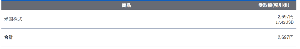 12月の受け取り総額は 17.42ドル・2,697円 でした。