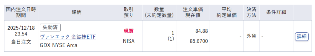 ① ヴァンエック 金鉱株ETF(GDX)・・・昨日に引き続いての注文でしたが、上手く約定しませんでした。