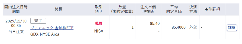 ① ヴァンエック 金鉱株ETF(GDX)・・・最近はこの銘柄をよく狙っていて約定できませんでしたが、昨日は上手く約定することができました。