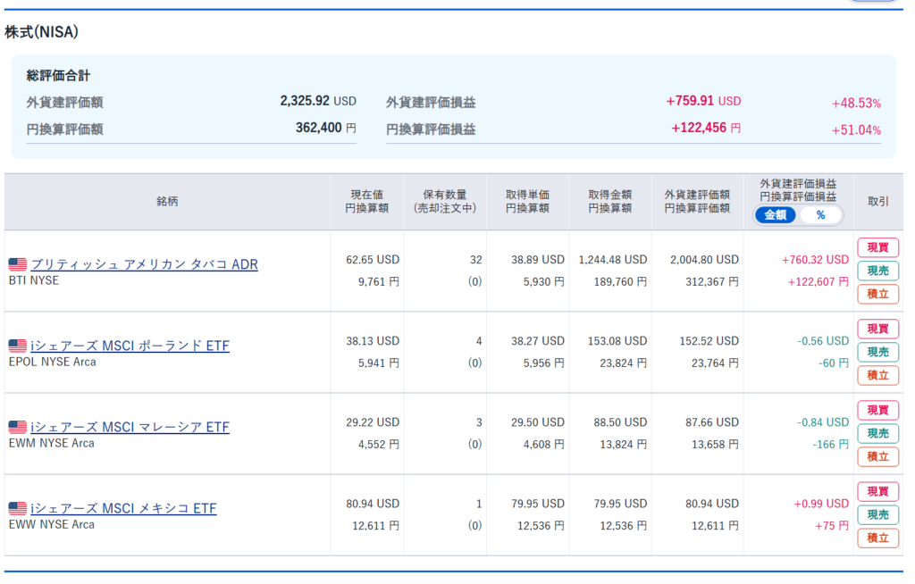①iシェアーズ MSCI マレーシアETF(EWM)・・・こちらの銘柄は、最近買い始めた分散投資の銘柄のひとつです。指値よりも終値の方が低かったですね。これからも分散投資をしていくにあたって有益な投資先のひとつと考えておりますので、これからも買い増しをしていく予定です。