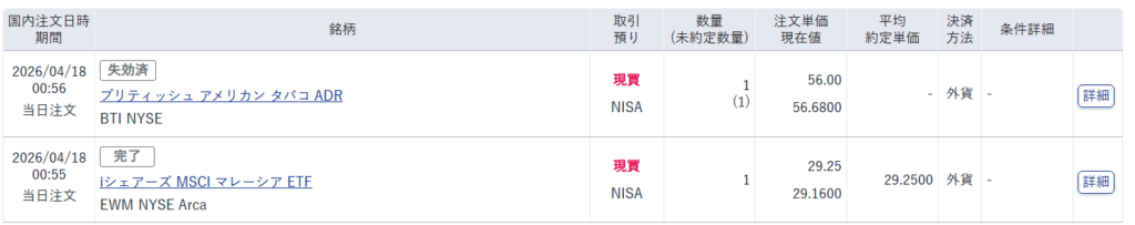 iシェアーズ MSCI マレーシアETF(EWM)・・・こちらの銘柄については、以前より分散投資を目的として購入している分の買い増しです。ここ最近は下落分を取り戻すように上昇しております。分散先のひとつとして今後も買い増しをしていこうと考えてます。