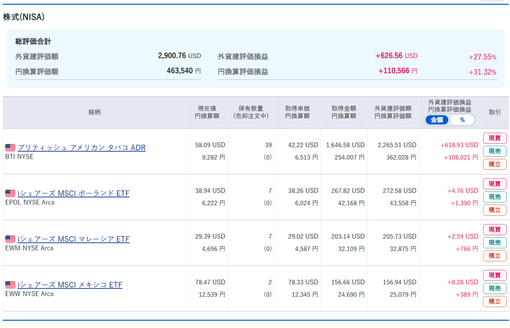 NISA口座 ドルでは+35.83 ドルです。円では+6,239 円です。