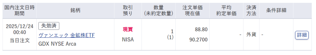 昨日は1件の注文を出しましたが、約定しませんでした。