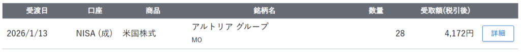 アルトリアグループ(MO)様から配当をいただきました。アルトリアグループ(MO)の皆様、配当ありがとうございました。