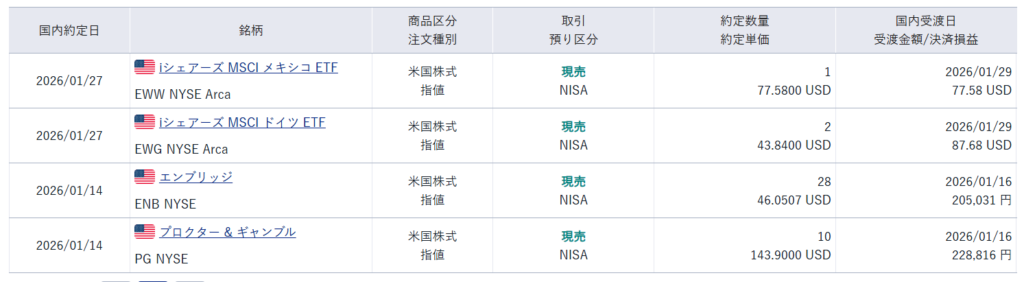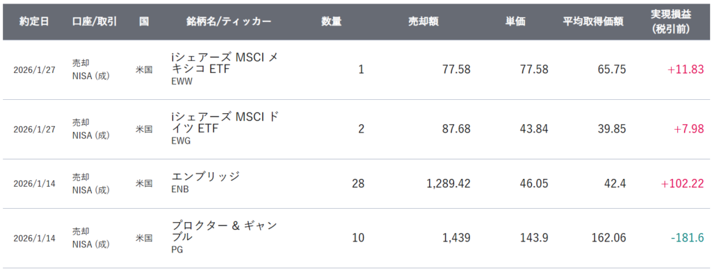 今月売却したのは、iシェアーズ MSCI メキシコETF(EWW)・iシェアーズ MSCI ドイツETF(EWG)・エンブリッジ(ENB)・プロクター&ギャンブル(PG)ですね。