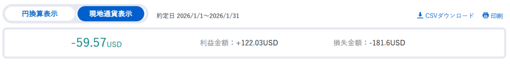 - 銘柄別の損益(ドル換算) +11.83+7.98+102.22-181.60=-59.57ドル