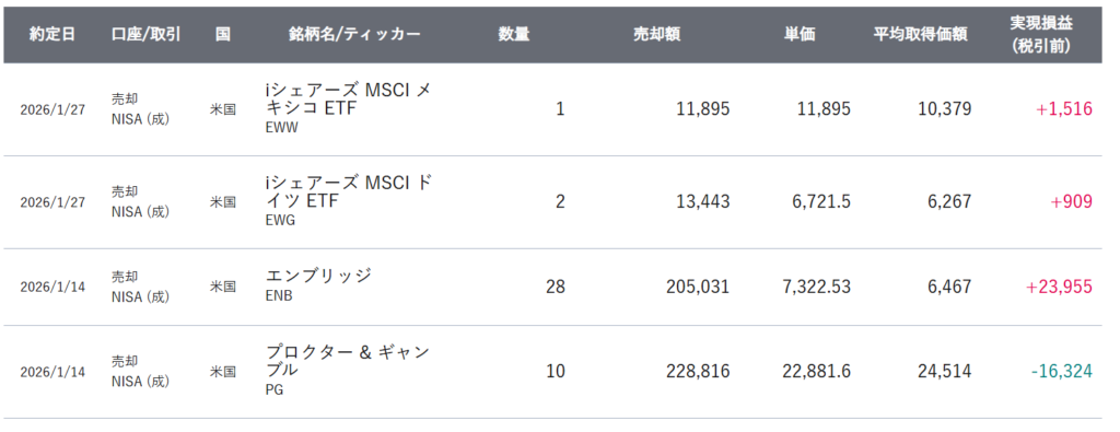 エンブリッジの売却の利益が大きかったですね。ただしは2026年4月現在、売却した時よりも株価を上げております。つまり失敗ですね。そしてマイナスの大きかったプロクター&ギャンブルも直近では大きく下げてますが、売却した以降に株価を大きく上げていましたので、この売却も失敗ですね。