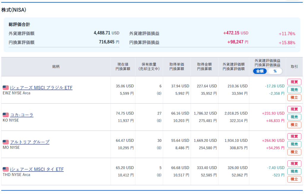 NISA口座 ドルでは-52.44ドルとなりました。円では-8,375円となりました。
