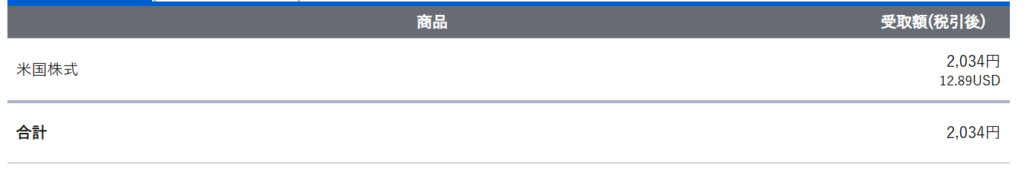 4月の受け取り総額は 12.89ドル・2,034円 です。